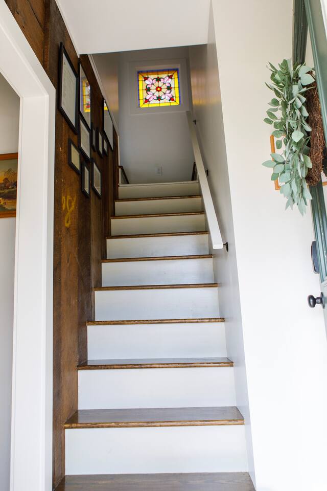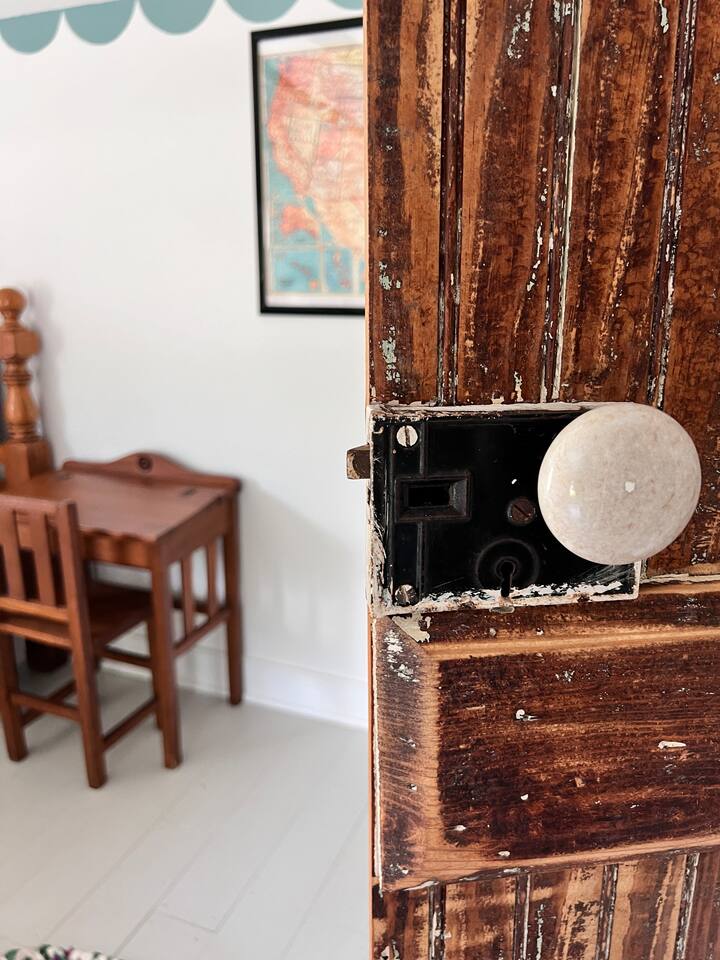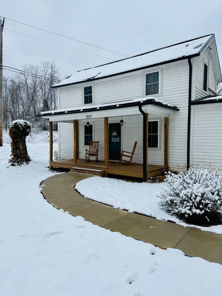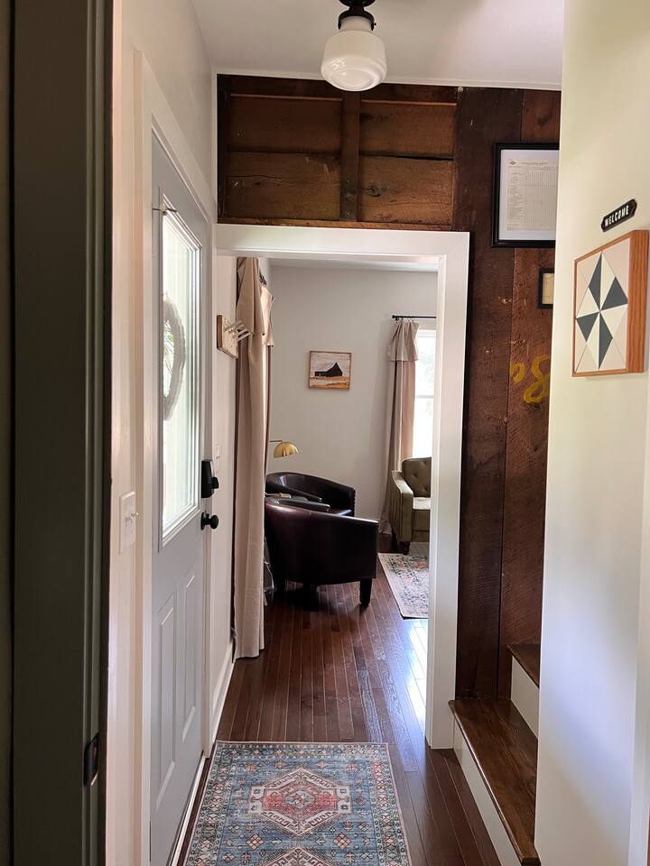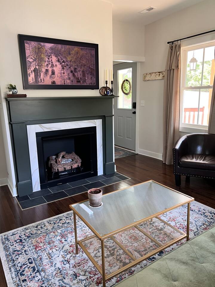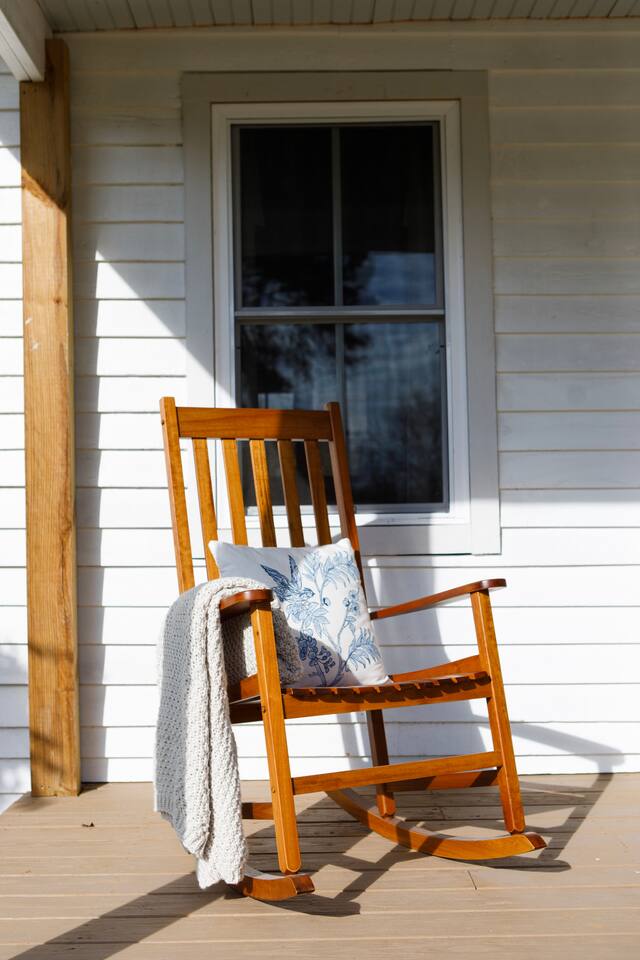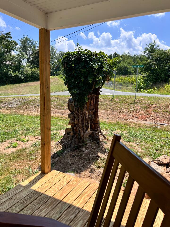 Rock on the front porch & look out onto the center of town where the train used to stop for people to get their groceries & go to the post office. Now this once abandoned home has been completely revitalized but wrapped in historic elegance for a comfortable, spacious stay. • 1,200 sq ft • high end Lg kitchen • train tree carving 🚂 • disc golf basket 🥏 • master suite w/double vanity & spa 🚿 • Frame tv • Pac-Man 👾🕹️ • Gas log fireplace & outdoor firepit • large driveway *goat visit by request