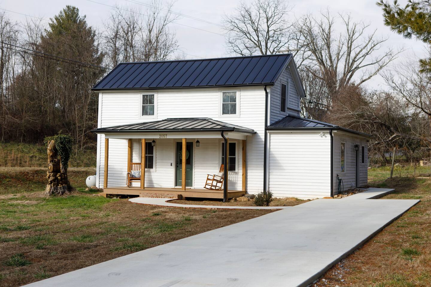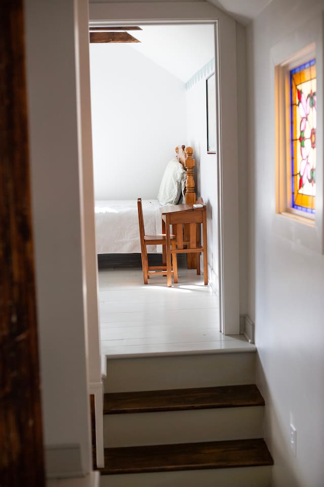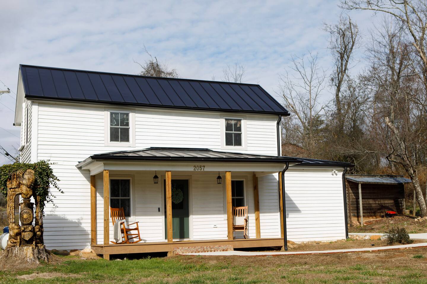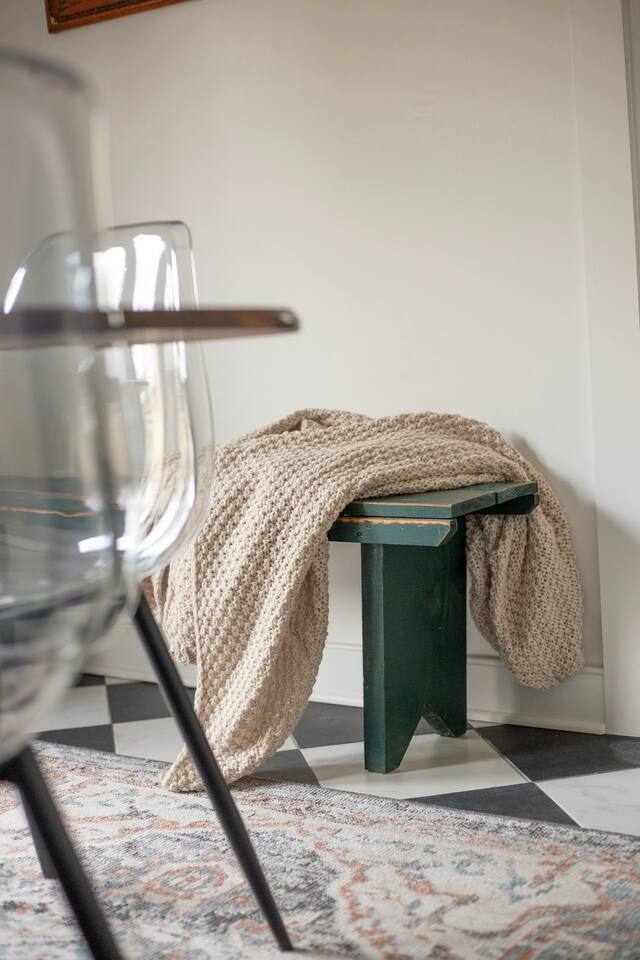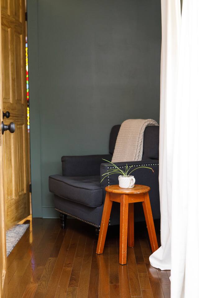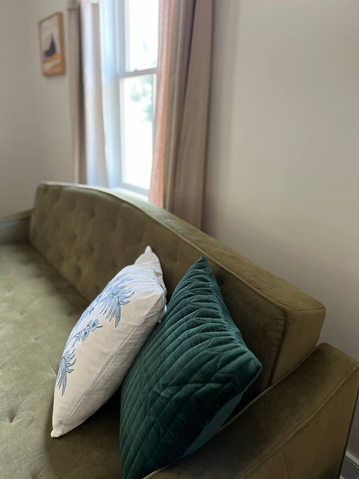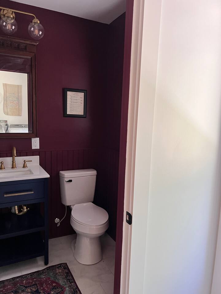 Rock on the front porch & look out onto the center of town where the train used to stop for people to get their groceries & go to the post office. Now this once abandoned home has been completely revitalized but wrapped in historic elegance for a comfortable, spacious stay. • 1,200 sq ft • high end Lg kitchen • train tree carving 🚂 • disc golf basket 🥏 • master suite w/double vanity & spa 🚿 • Frame tv • Pac-Man 👾🕹️ • Gas log fireplace & outdoor firepit • large driveway *goat visit by request